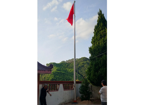旗桿頂端裝置一般由一個(gè)裝飾性園球和一滑輪組成。這種裝置雖能滿足升降旗作用。但不能避免旗幟與旗桿纏繞而使旗幟展不開。